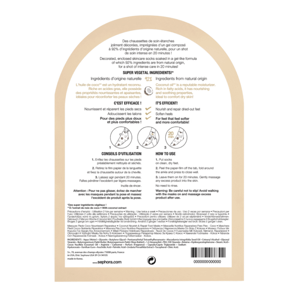 قدميكِ تتحمل الكثير يومياً وتستحق عناية خاصة. ماسك القدمين بجوز الهند مصنوع من مكونات طبيعية بنسبة 92%، ومشبّع بجل غني بخلاصة زيت جوز الهند المعروف بخصائصه المرطبة والمغذية. يمنحكِ راحة فورية ويعيد النعومة لبشرة القدمين في 20 دقيقة فقط.